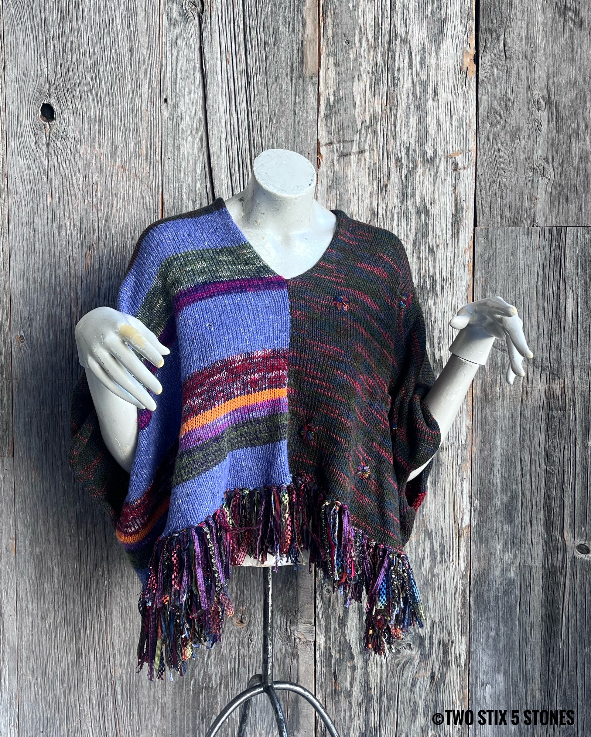 Cozy meets chic in this handmade knit crop poncho, thoughtfully designed to blend comfort with style. Featuring sleeves and a flattering cropped cut, this sweater is perfect for layering or making a statement on its own. The textured stitches and artisanal finish give it a one-of-a-kind charm, making it an effortless addition to any modern, laid-back look. It is accented with luxe fringe and surface embellished flowers. Dress it up with high-waisted trousers or keep it casual—this sweater is made to move with you.