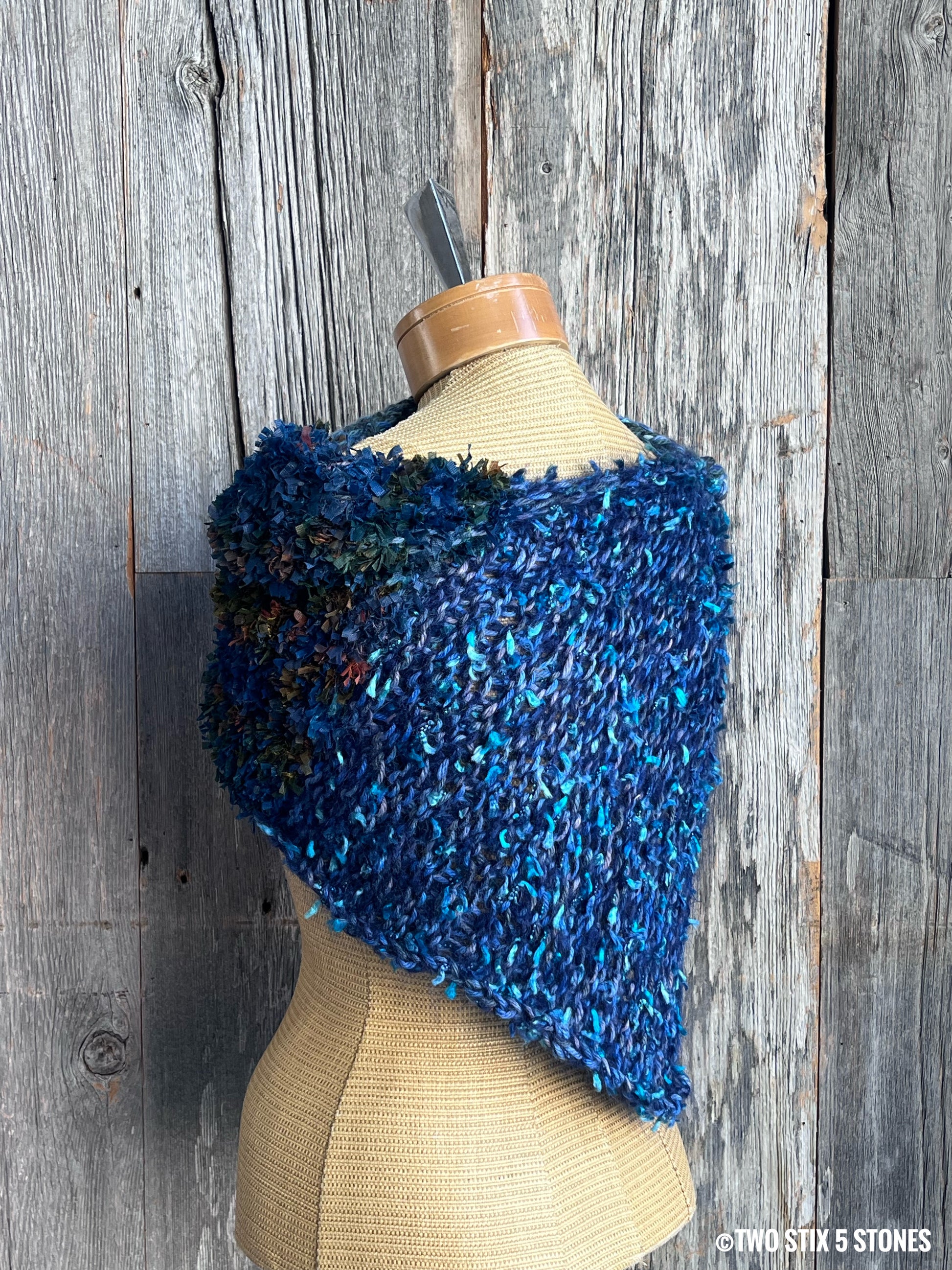 This handcrafted shawl is designed to be asymmetrical for a wow factor. It is accented with a vintage button.