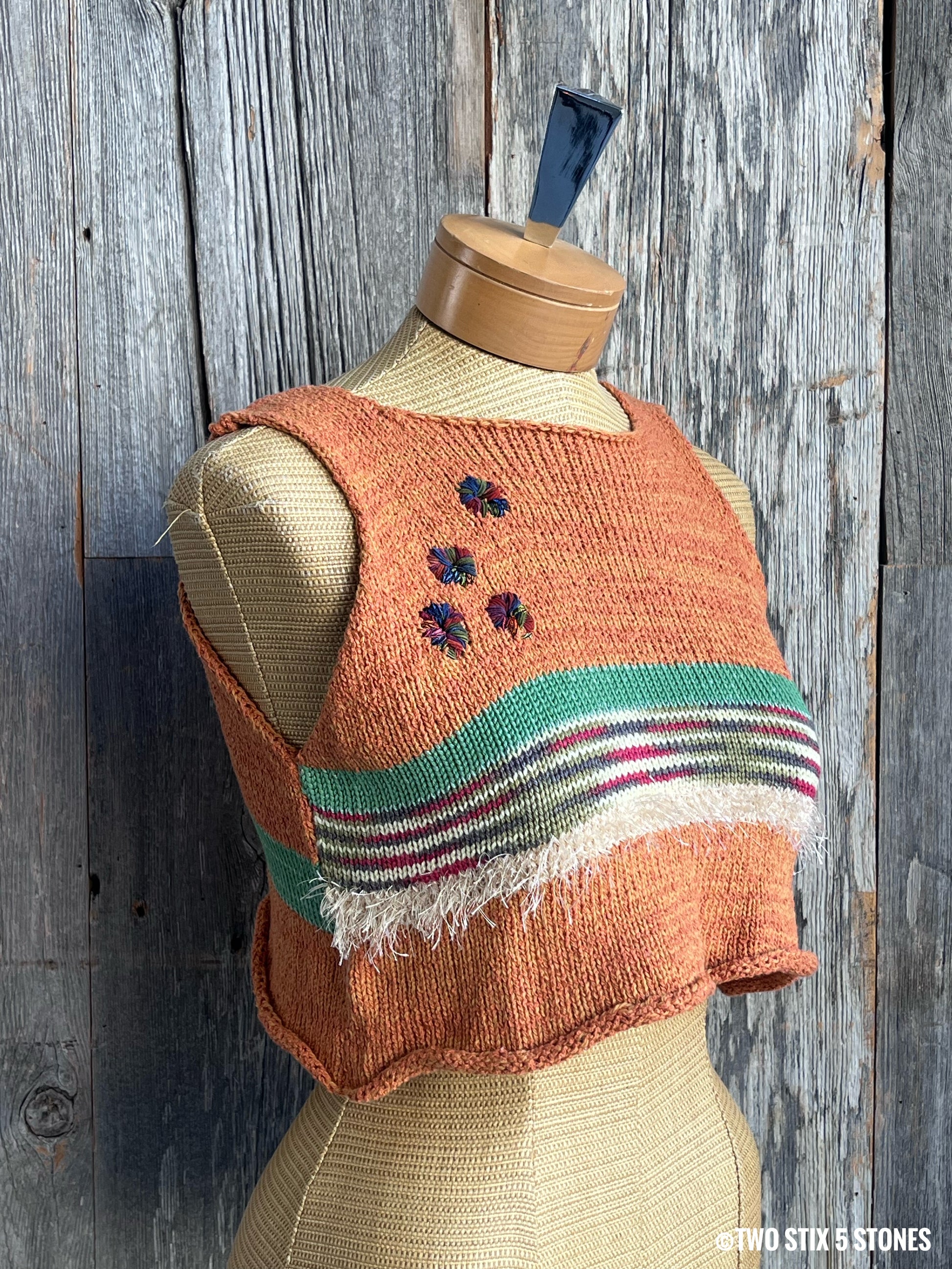 Add a burst of personality to your wardrobe with this handmade knit slipover. Expertly crafted with care and creativity, each piece is a unique blend of bold colors and soft textures, making it as joyful to wear as it is to look at. It is surface embellished with flowers. Made from high-quality yarn, this cozy slipover features a relaxed fit. It's a statement piece that brings charm and color to every outfit.